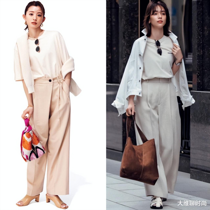 浅色系的T恤,搭配浅米色阔腿裤,整体色调和谐统一,营造出干净利落的视觉效果 。白色短款外套增添随性与层次感。