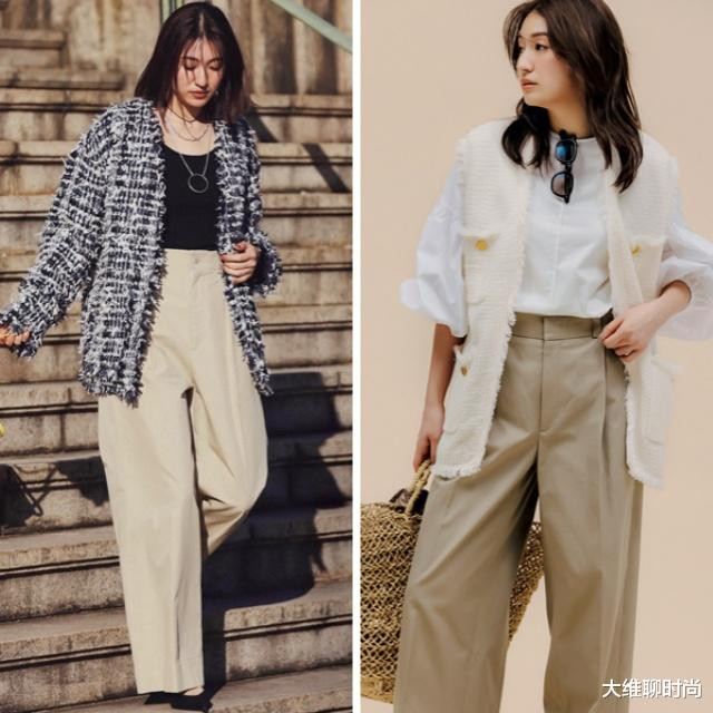 黑白粗花呢外套质感独特,纹理丰富,彰显精致与复古韵味;内搭黑色简约上衣,经典百搭又凸显干练;米色阔腿裤垂坠感好,修饰腿型,增添随性大气感。
