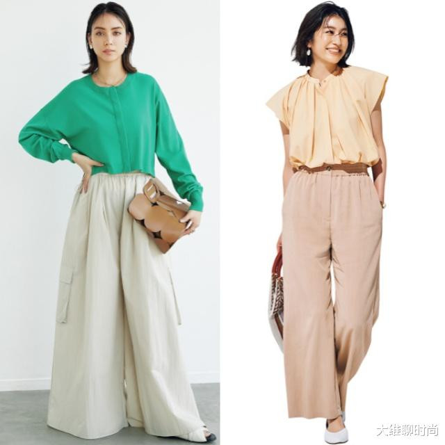 亮绿色圆领上衣简约大方,色彩鲜明,带来活力感;搭配米白色宽松阔腿裤,垂坠感佳,营造随性氛围。